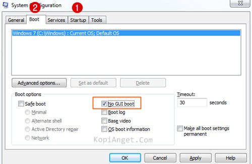 Kemudian pilih tab Boot dan check "No GUI boot", klik Apply dan tutup jendela msconfig dengan OK.